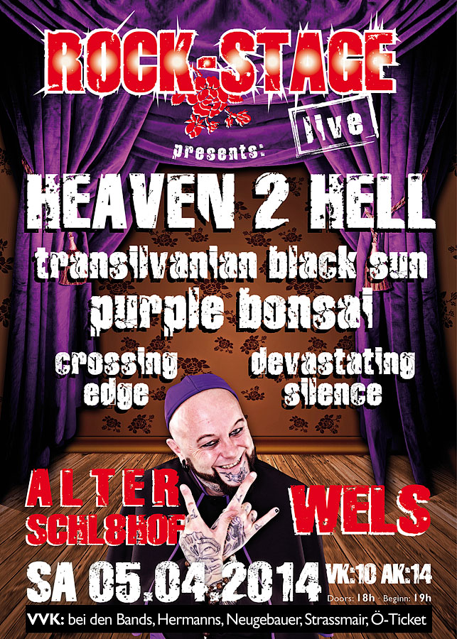 Devastating Silence werden die Rockshow eröffnen gefolgt von Crossing Edge, Purple Bonsai und Transilvanian Black Sun werden euch gehörig einheizen liebe Rock und Metal Heads! Wenn es dann so richtig himmlisch gut und höllisch laut wird, mit Klassikern von Black Sabbath, Ozzy, Dio, Metallica, Pantera, Prong und Judas Priest sind wir (Heaven2Hell) gerade dabei alles in schutt und Asche zulegen! Mit neuem Line Up werden wir euch eine fette Show bieten und mit euch eine geile Party feiern!!! In diesem sinne!